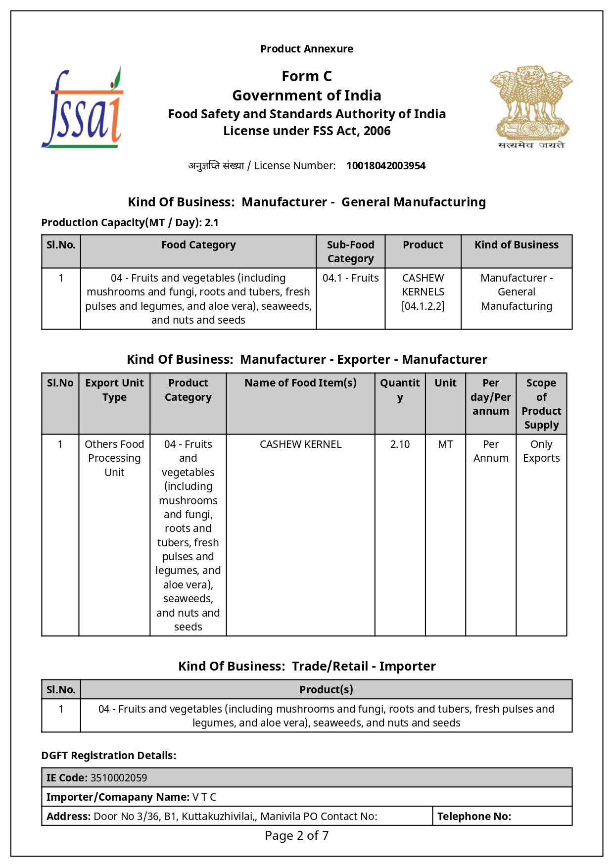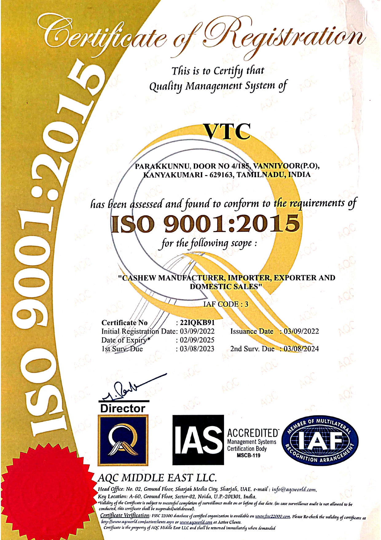 VTC is a leading Manufacturer, Importer, Exporter and Domestic Sales of cashews in south India established in the year 2010 under the Partnership Act 1932, With an experienced team over 25 years in the cashew Industry .